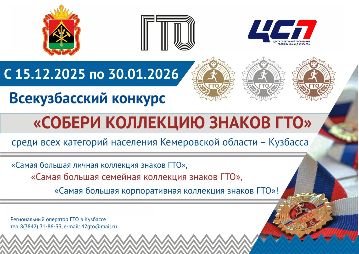 С 15 декабря 2025 года по 30 января 2026 года в Кемеровской области — Кузбассе проходит региональный конкурс ВФСК ГТО «Собери коллекцию знаков ГТО»Конкурс направлен на вовлечение всех слоев населения Кузбасса в систематические занятия физической культурой и спортом, укрепление семейных ценностей, традиций совместного участия в физкультурно-оздоровительных мероприятиях детей и их законных представителей, распространение практики организации корпоративного досуга и современных форм управления персоналом средствами физической культуры.