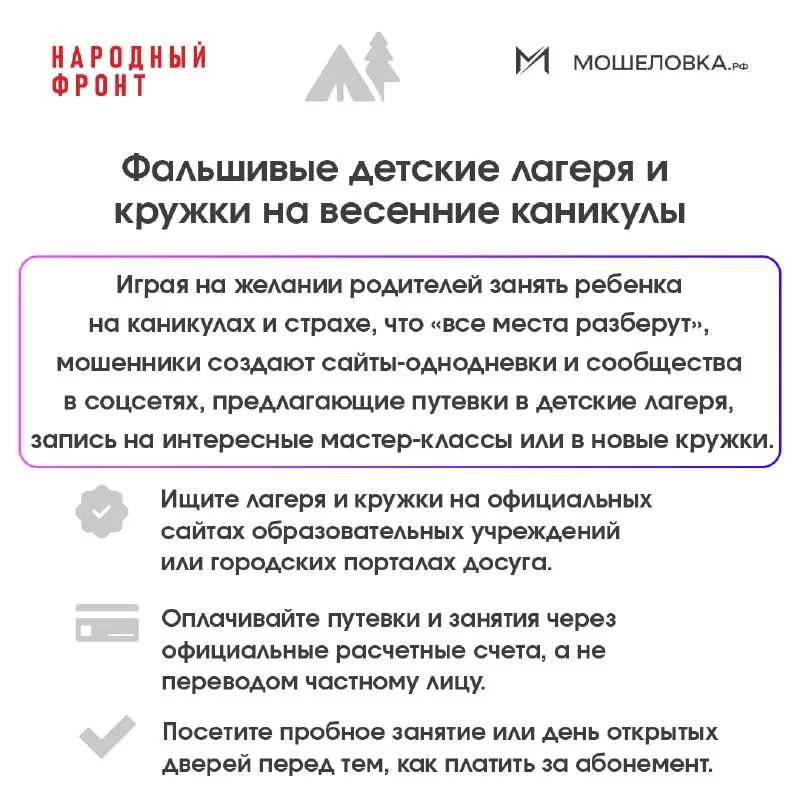 В фокусе - фальшивые детские лагеря, собирающие предоплаты и исчезающие вместе с ними, и лже-диспансеризация, цель которой — получить доступ к вашим «Госуслугам». Подробности в карточках.