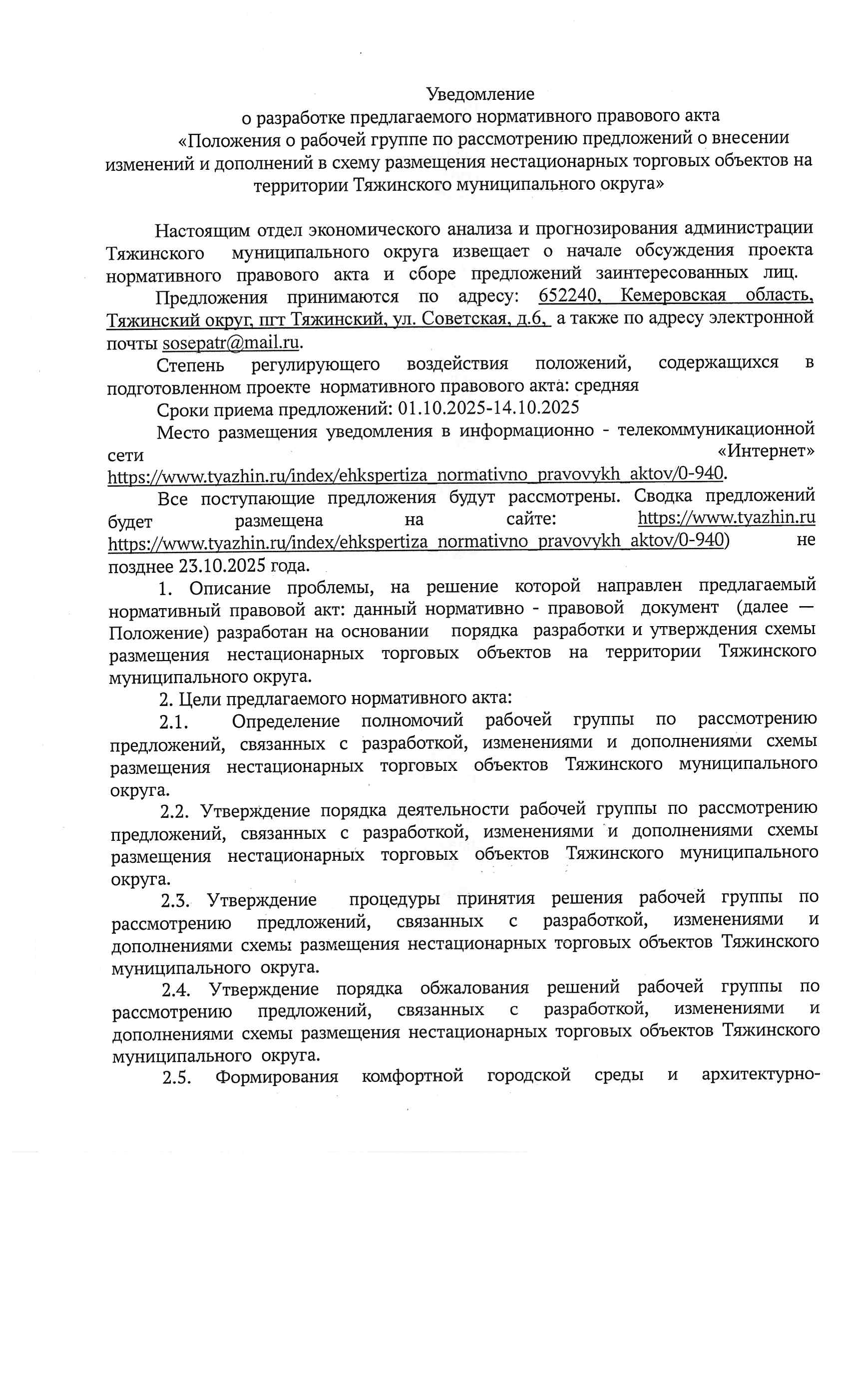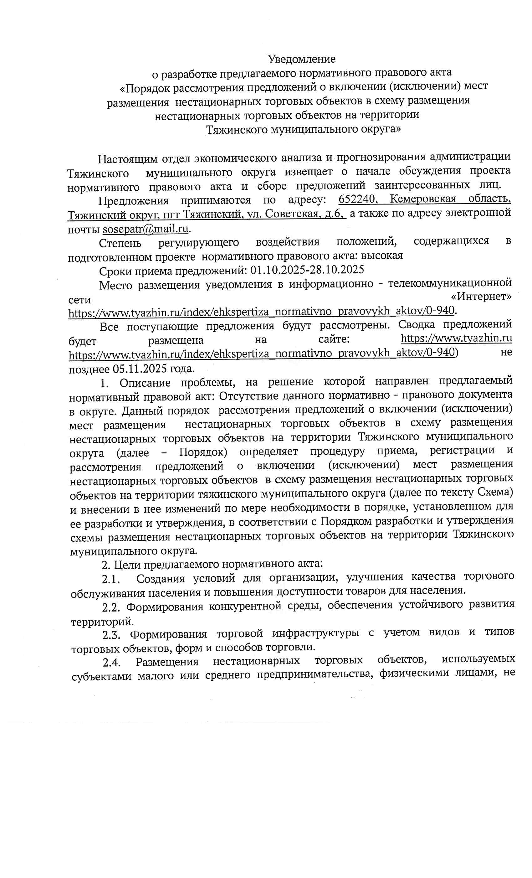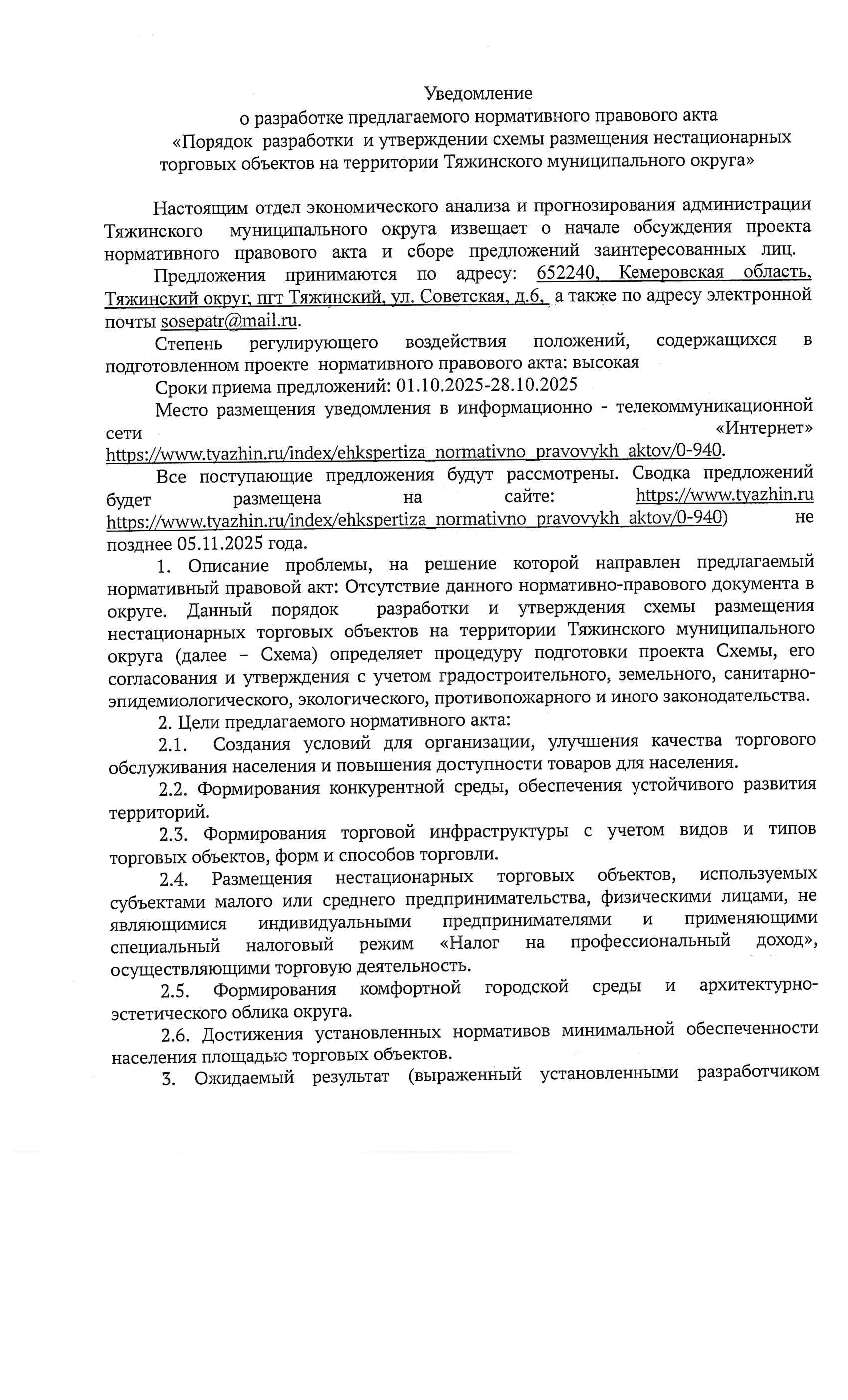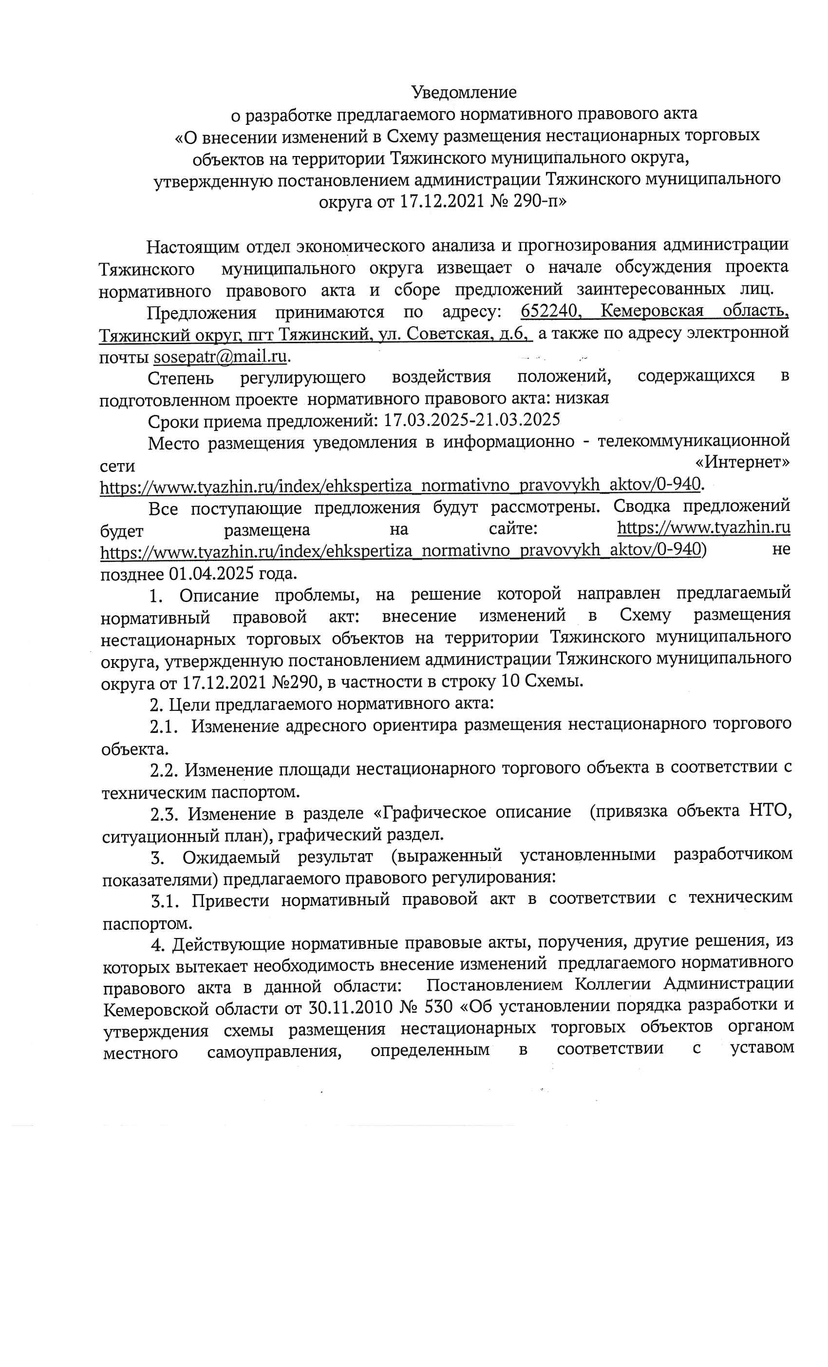 Постановление №62-п от 28.04.2025 «О внесении изменений в Схему размещения нестационарных торговых объектов на территории Тяжинского муниципального округа, утвержденную постановлением администрации Тяжинского муниципального округа от 17.12.2021 № 290-п»- Уведомление о разработке предлагаемого нормативного правового акта