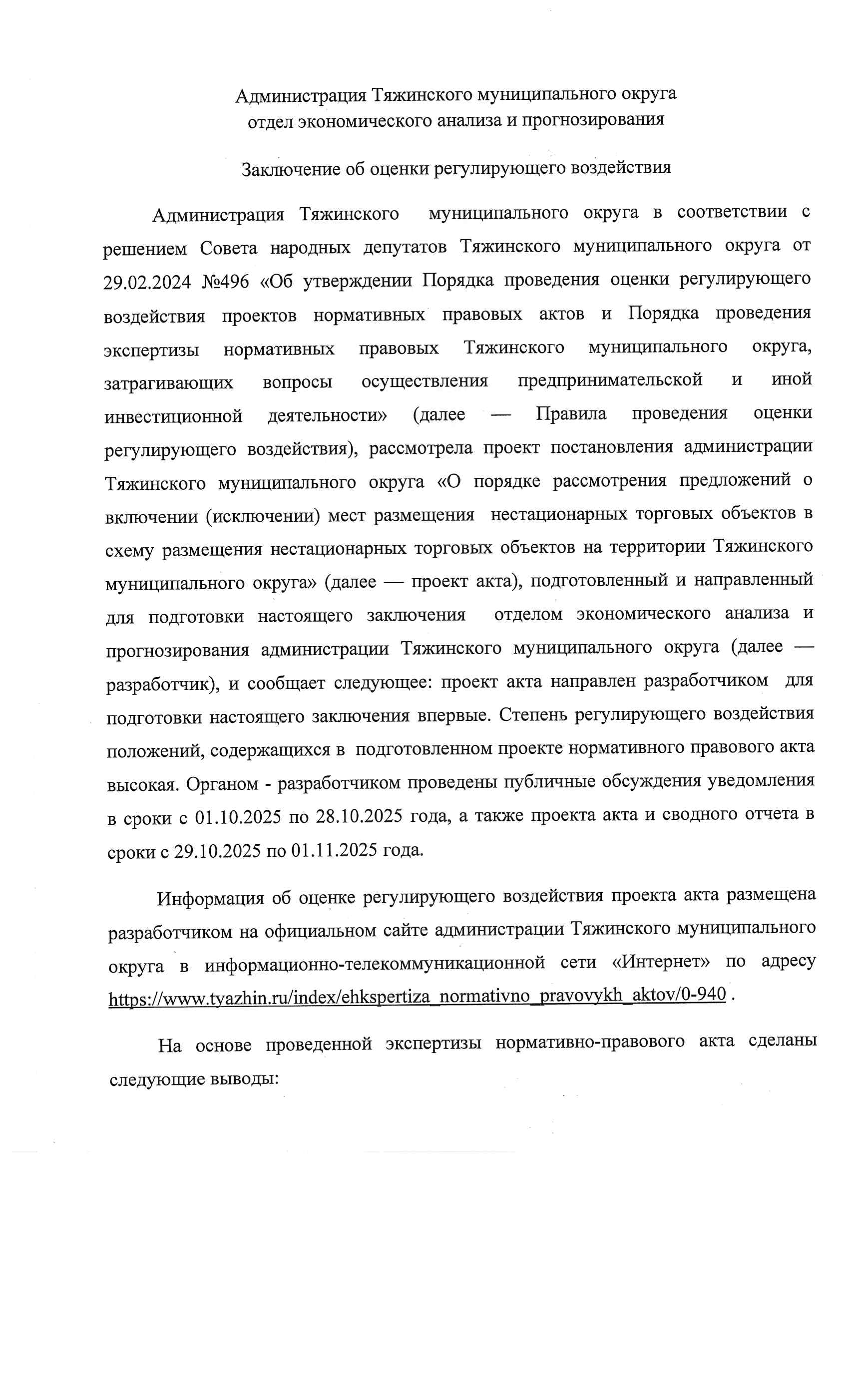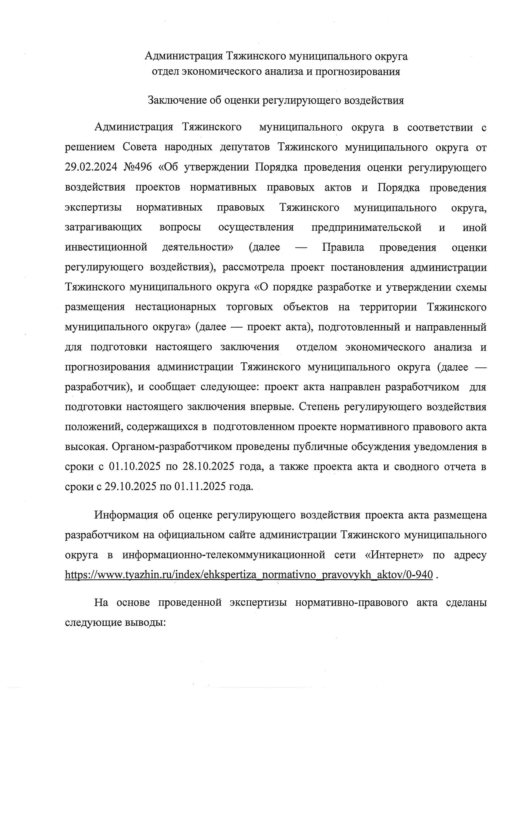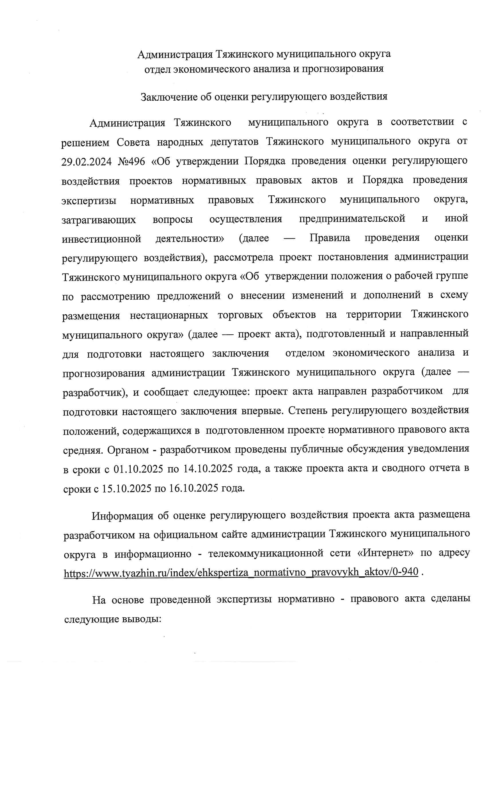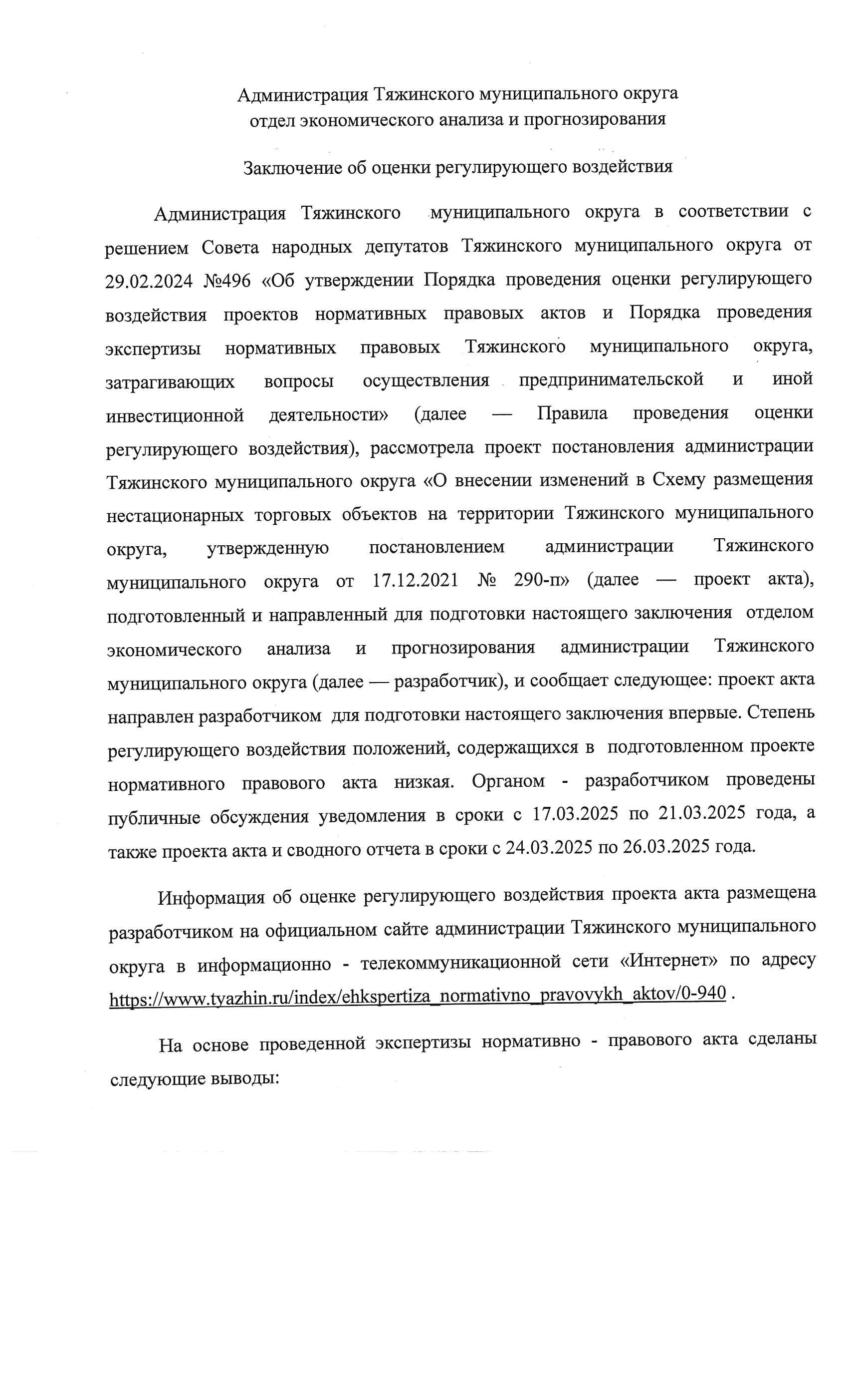 Постановление №62-п от 28.04.2025 «О внесении изменений в Схему размещения нестационарных торговых объектов на территории Тяжинского муниципального округа, утвержденную постановлением администрации Тяжинского муниципального округа от 17.12.2021 № 290-п»- Уведомление о разработке предлагаемого нормативного правового акта