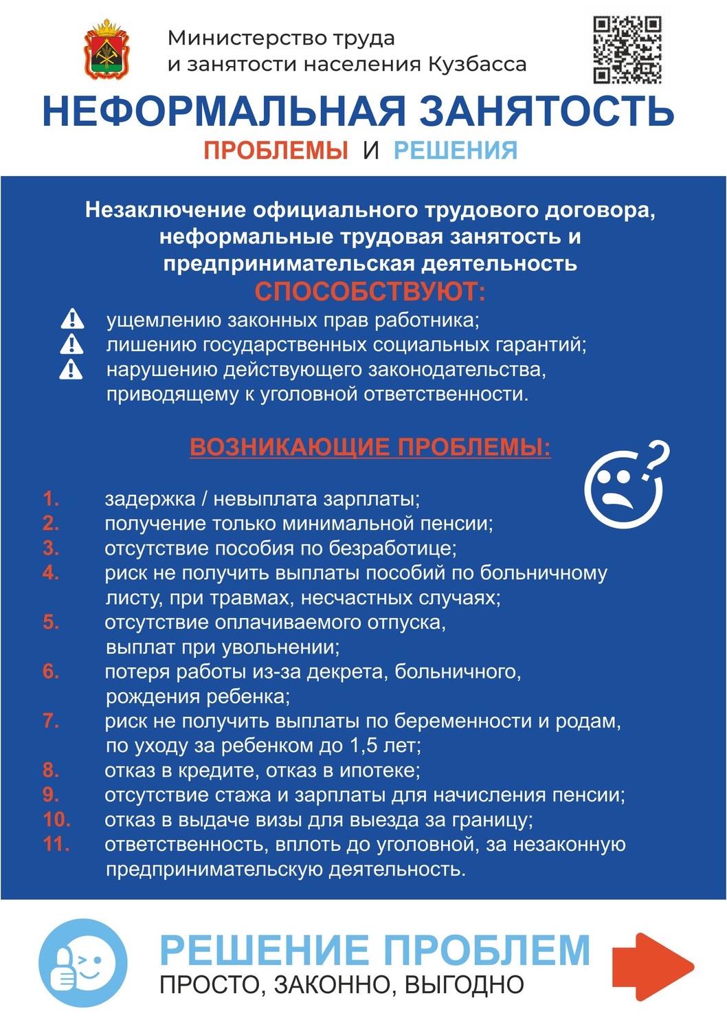Неформальная занятость – это наем персонала без оформления, выплата заработной платы «в конвертах». Не оформленный в установленном законодательством порядке прием на работу лишает Вас заслуженного пенсионного обеспечения, не будет давать права на выплату пособия по временной нетрудоспособности в случае несчастного случая на производстве и профессионального заболевания, пособия по безработице, права на получение ежегодного оплачиваемого отпуска и социальных гарантий.