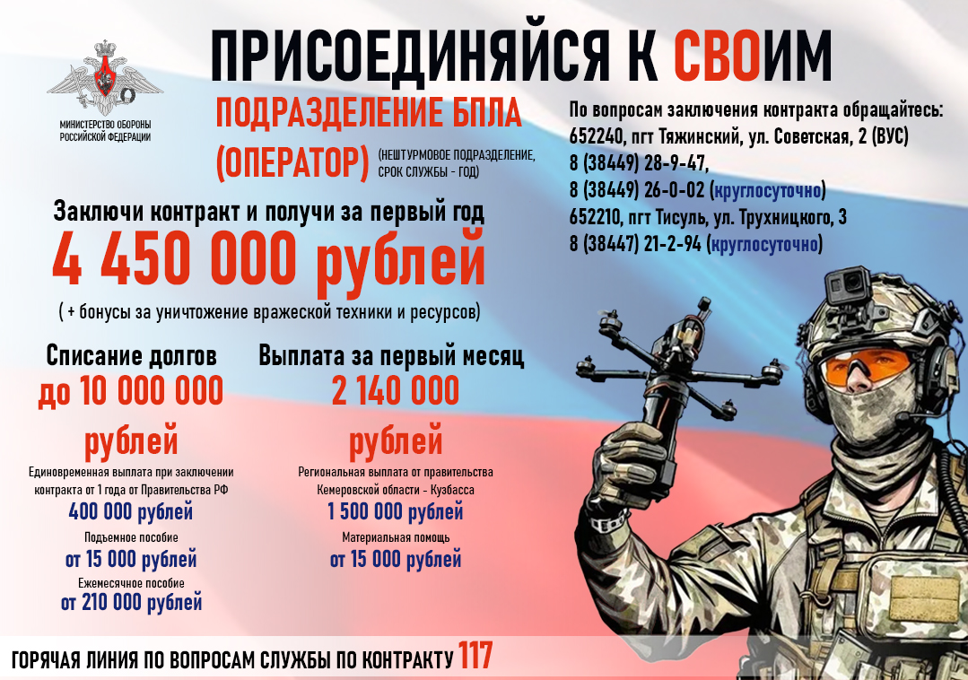По всем вопросам обращаться в пункт отбора на военную службу по контракту по адресу: пгт Тяжинский, ул. Советская 2, Военно учетный стол, телефон: +7(38449)28947