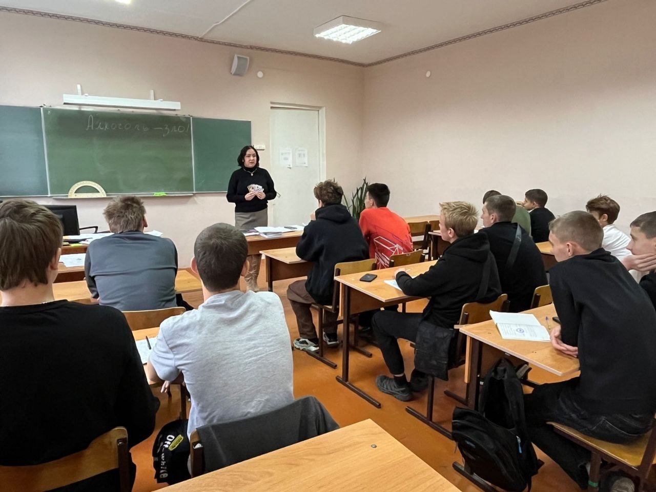 С 22 по 28 октября 2025 года педагог-психолог Тяжинского агропромышленного техникума Рябова Анна Владимировна провела лекционные занятия по теме «Вред алкоголя на организм подростка» для студентов 1-2 курсов. В ходе лекций была включена ситуационная игра «Нетрезвый выбор. Последствия», где студенты активно обсуждали причины первой пробы алкоголя и совместно с Анной Владимировной искали альтернативные пути и способы отказа от вредной привычки.