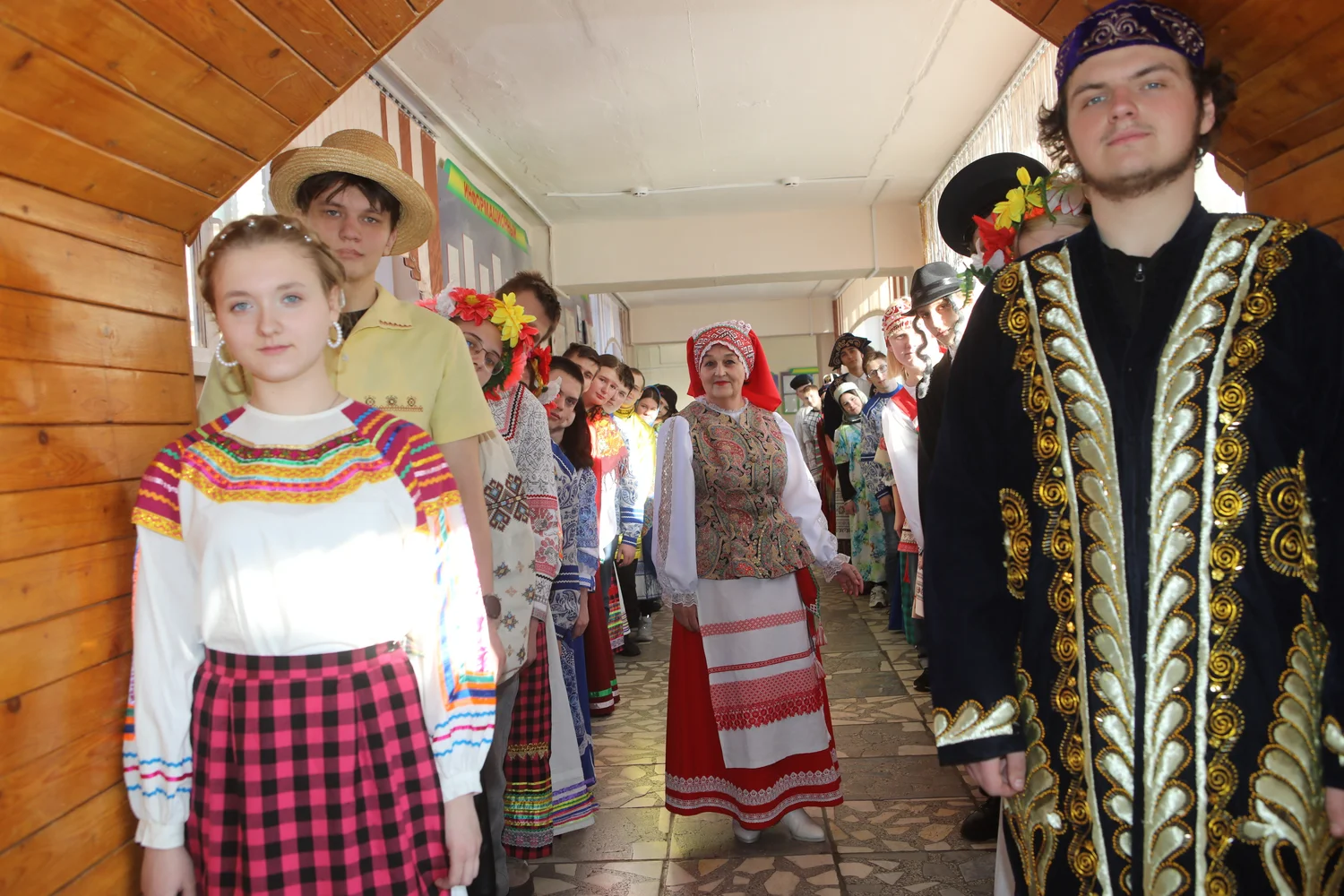 Просторный холл техникума на время превратился в яркую площадку межнационального общения. Студенты в национальных костюмах, представляющие разные культуры нашей с