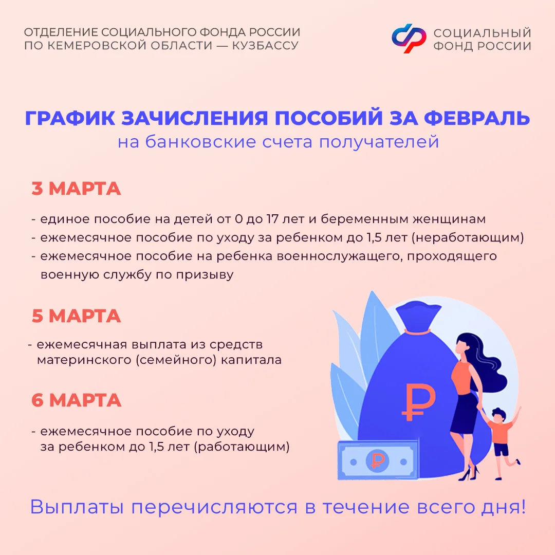 Отделение СФР по Кузбассу напоминает: детские пособия перечисляются за предыдущий месяц (то есть в марте – за февраль), а пенсии и социальные выплаты – за текущий. Выплаты на банковские счета перечисляются в течение всего дня. Если деньги не поступили на счет утром, дождитесь их зачисления до окончания дня.