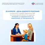 Также 25 апреля пройдет День единого пособия в клиентских службах регионального Отделения СФР: - в Центральном районе города Кемерово (ул. Дзержинского, 4а) - в Центральном районе города