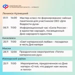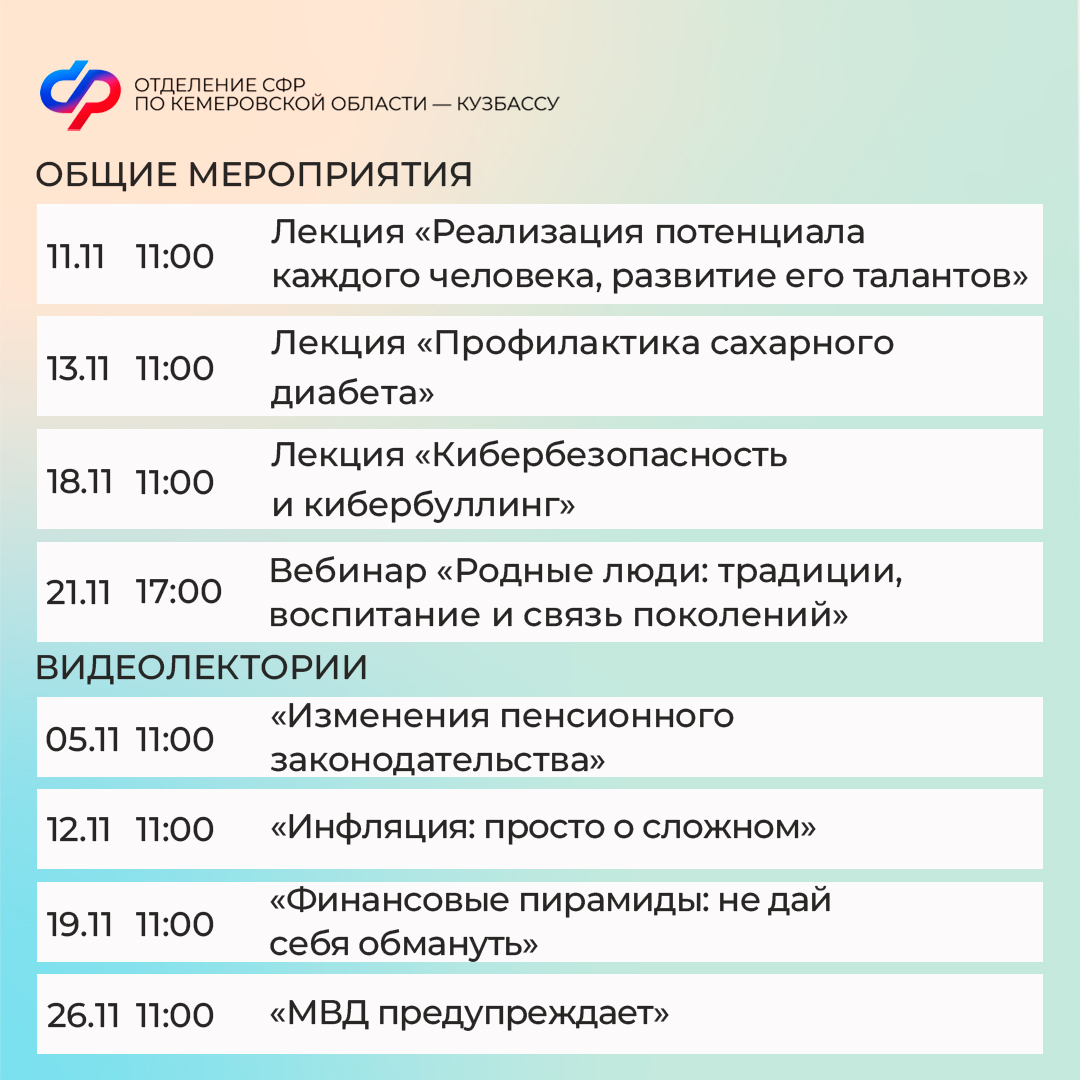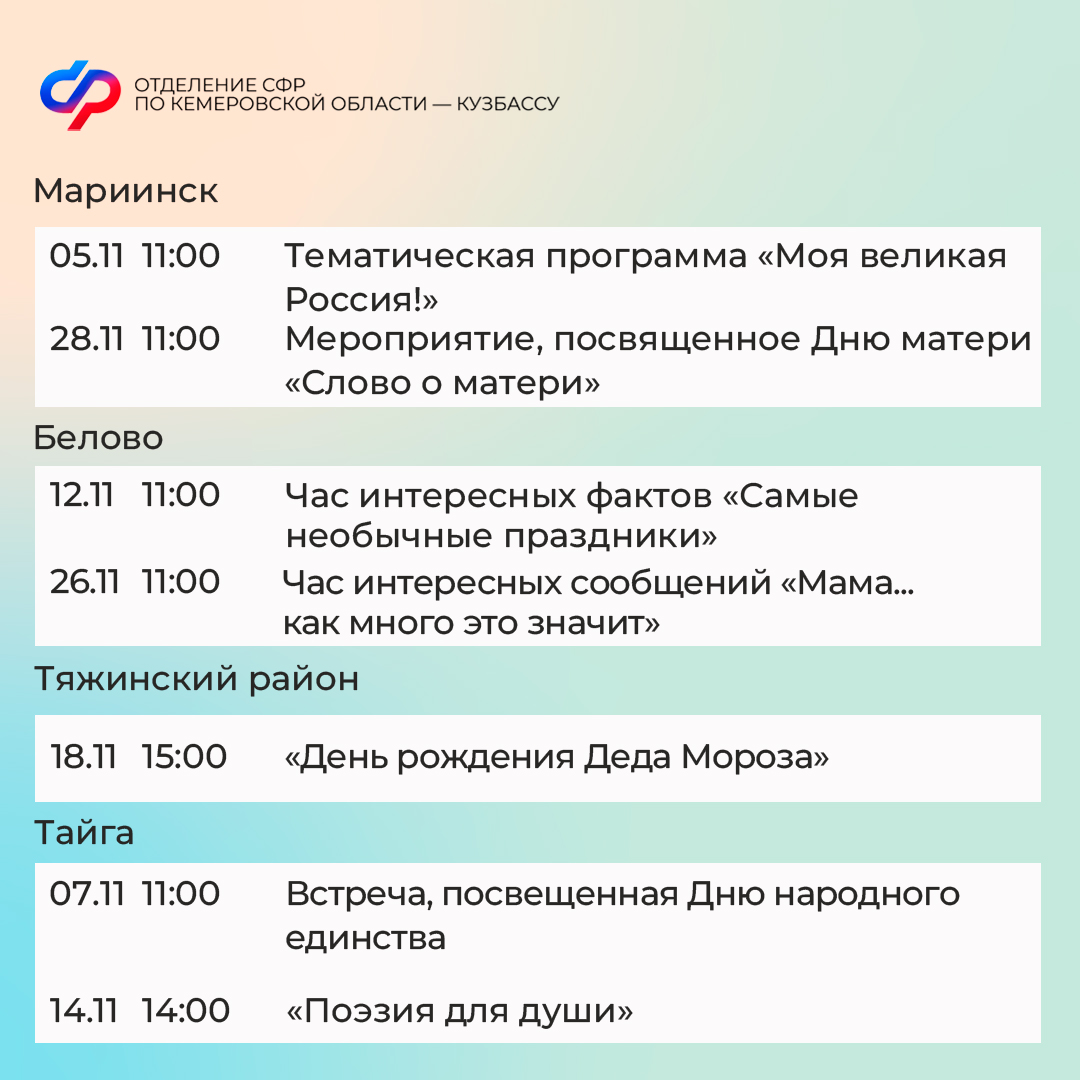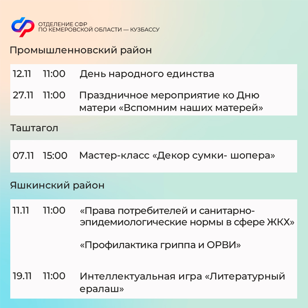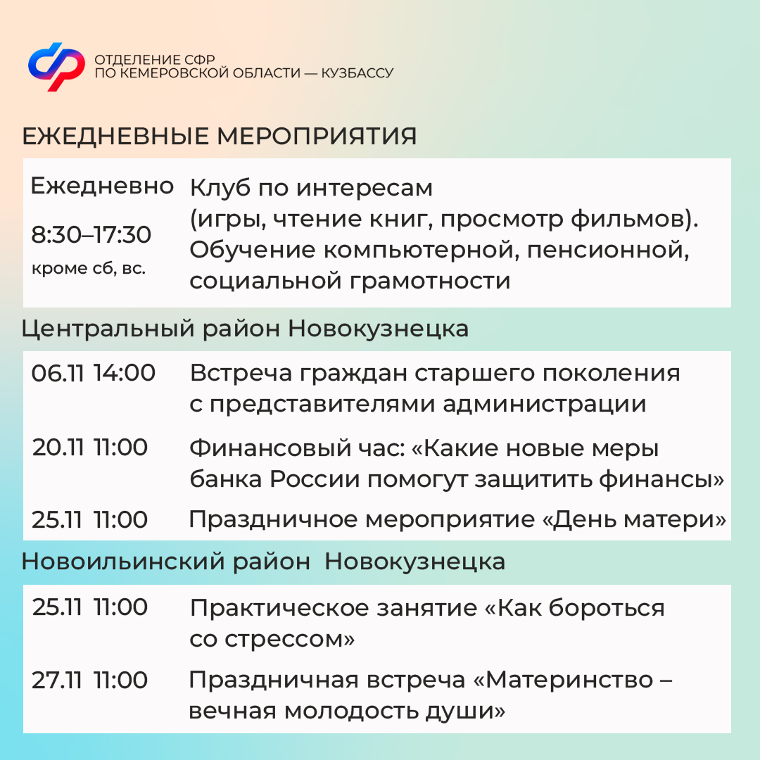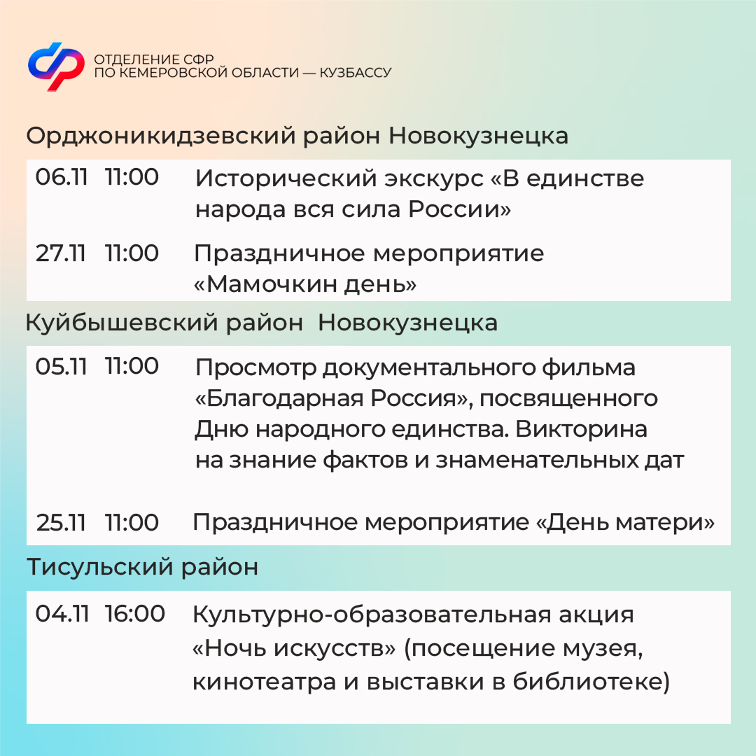Главная » 2025 Октябрь 30 » Афиша ноября в центрах общения старшего поколения Афиша ноября в центрах общения старшего поколения Афиша ноября в центрах общения старшего поколения: народное единство, вебинары по финансовой грамотности, мамин день, мастер-классы и викториныНоябрь богат на праздники и интересные события, которые не обойдут вниманием и в центрах общения старшего поколения Отделения Соцфонда по Кемеровской области. День народного единства Поговорим об истории праздника, силе и сплоченности нашего народа на тематических встречах и викторинах. День матери Это повод собраться вместе по-семейному. На праздничных программах, которые пройдут во всех центрах общения, вас ждут: - Трогательные поздравления и подарки от внуков - Душевные песни под баян - Мастер-классы по рукоделию - Сладкий стол и теплые разговоры Видеолектории по финансовой грамотности Разберемся, что такое инфляция и как грамотно управлять бюджетом в пенсионном возрасте. А также как не попасть в финансовую пирамиду и уберечься от мошенников. Полезно и актуально! Приглашаем вас за новыми знаниями, творчеством и хорошим настроением в наши центры в ноябре!