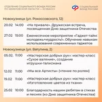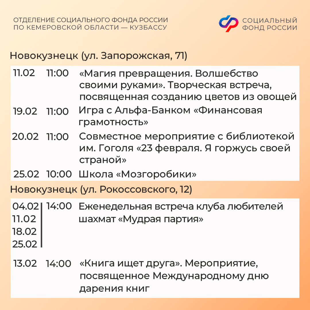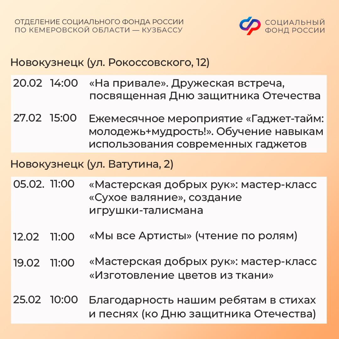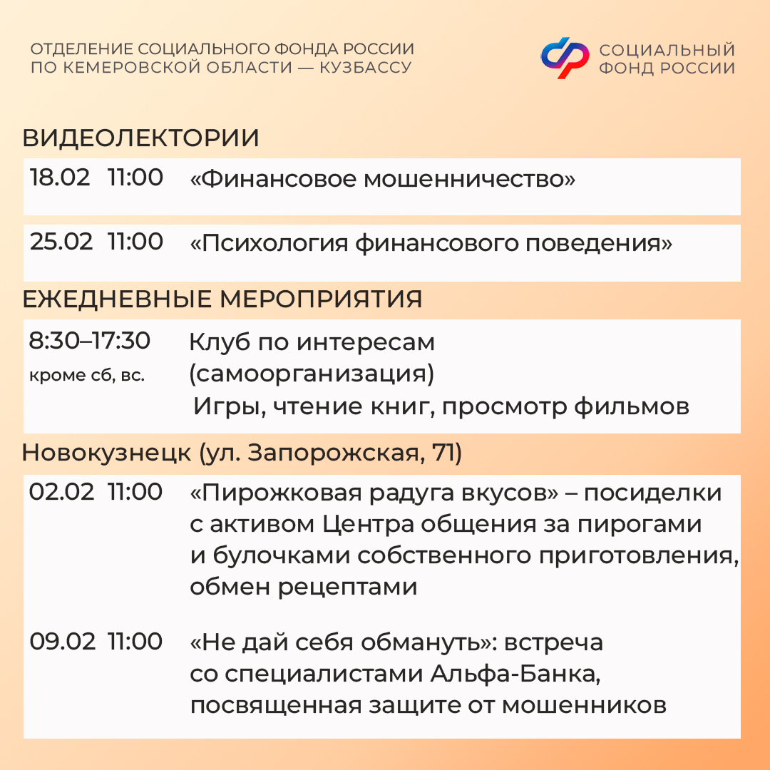 Главная » 2026 Январь 28 » Афиша событий в кузбасских центрах общения старшего поколения в феврале Афиша событий в кузбасских центрах общения старшего поколения в феврале День защитника Отечества, Масленица, уроки цифровой безопасности и финансовой грамотности, вебинары по здоровому образу жизни и кулинарные посиделки, мастер-классы и многое, многое другое!Афиша центров общения старшего поколения разнообразна и интересна. Подробнее о ней – в наших карточках и на страницах центров по ссылке: https://sfr.gov.ru/branches/kuzbass/ Присоединяйтесь к нам, приобретайте новых друзей и обогащайтесь новыми знаниями! Ждем вас в наших центрах общения! #СФРКузбасс #центрыобщения #ЦОСП