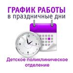 Главная » 2022 Декабрь 28 » График работы детского поликлинического отделения в праздничные дни График работы детского поликлинического отделения в праздничные дни 31.12.22 - 09:00-14:00 дежурный врач педиатр01.01.23 - праздничный день 02.01.23 - 09:00-14:00 дежурный врач педиатр 03.01.23 - выходной день 04.01.23 - 09:00-14:00 дежурный врач педиатр 05.01.23 - выходной день 06.01.23 - 09:00-14:00 дежурный врач педиатр 07.01.23 - праздничный день 08.01.23 - 09:00-14:00 дежурный врач педиатр ⠀ ☎️ Телефон саll центра 83844921013
