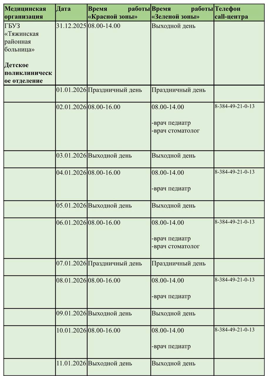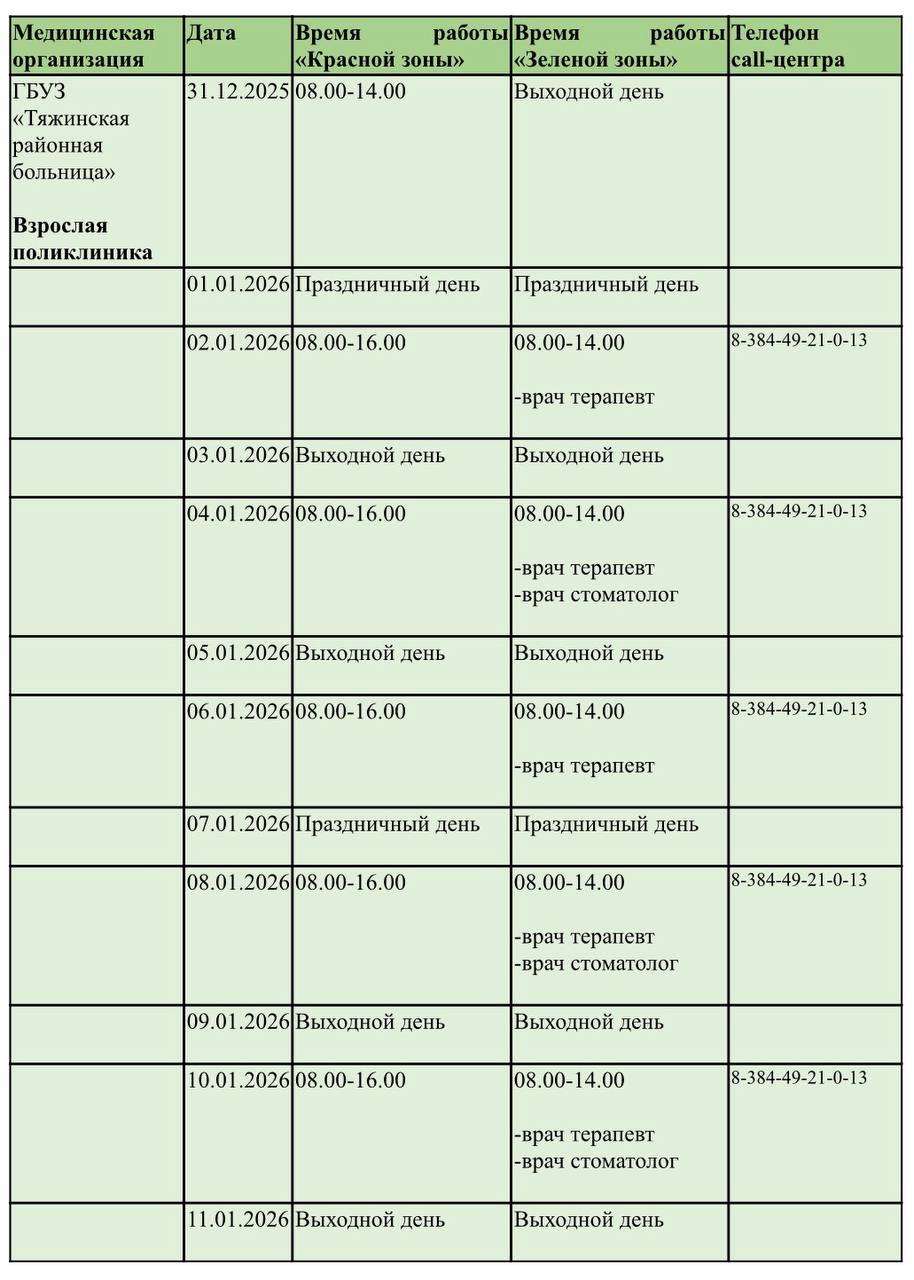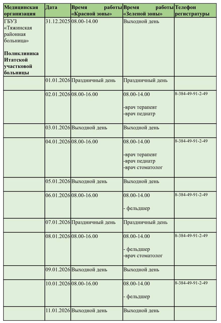 Главная » 2025 Декабрь 23 » График работы Тяжинской районной больницы в праздничные дни График работы Тяжинской районной больницы в праздничные дни Обратите внимание на график работы Тяжинской районной больницы в праздничные дни! Нам важно, чтобы вы сохранили свое здоровье. Напоминаем, в преддверии долгих выходных вы можете заранее позаботиться о себе: - пополнить запас препаратов - записаться к нашим врачам на онлайн-платформе "Врач42" vrach42.ru/service-fr... и через Госуслуги www.gosuslugi.ru/help/faq/d... Онлайн-запись - это удобно и просто. Будут вопросы - пишите нам! - call-центр 8-384-49-21-0-13 - Итатская участковая больница 8-384-49-91-2-49