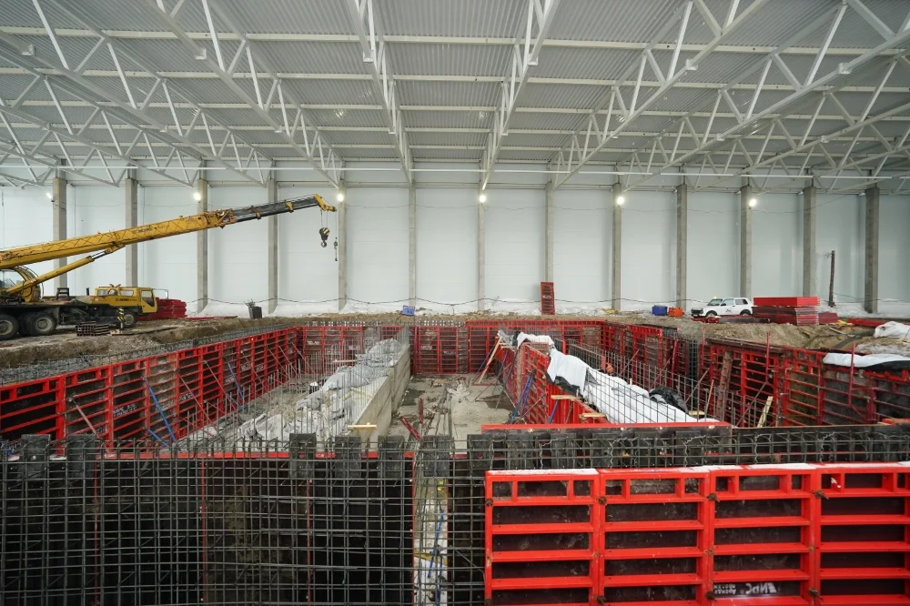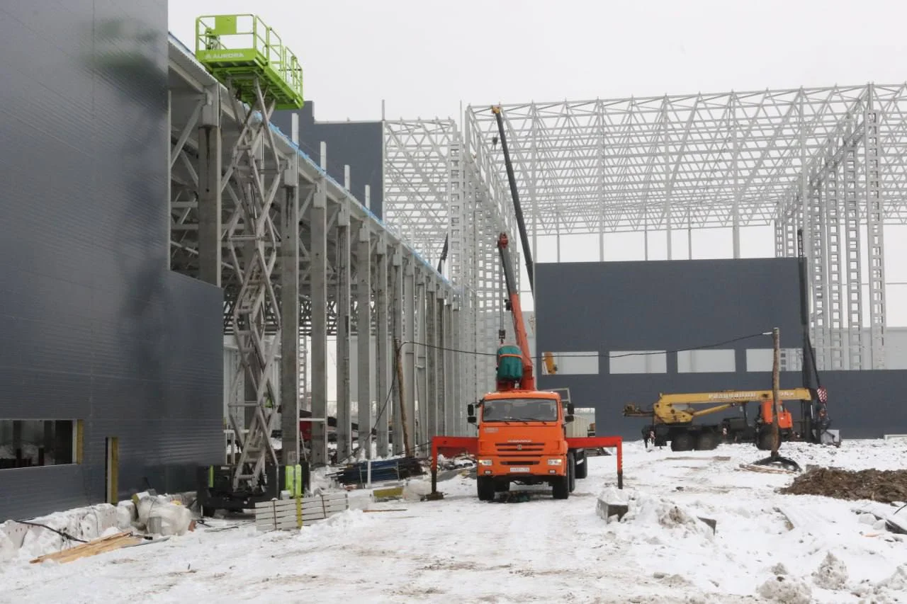 В настоящее время идет монтаж стенового и кровельного ограждения комбината, начат монтаж фундаментов под энергетическое и технологическое оборудование, продолжается возведение второго корпуса.