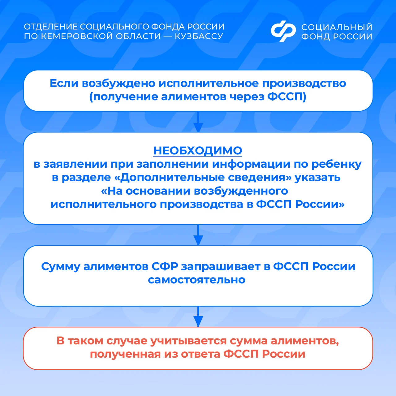 Главная » 2026 Февраль 10 » Как учитываются алименты на основании судебного решения при назначении единого пособия? Как учитываются алименты на основании судебного решения при назначении единого пособия? При назначении единого пособия алименты включаются в доход семьи. Порядок их учета зависит от ситуации.Получение алиментов по решению суда При заполнении заявления на единое пособие на сайте госуслуг следует: – в разделе «Дополнительные сведения» о ребенке указать: «На основании судебного решения или судебного приказа» – указать сумму алиментов, фактически полученную за расчетный период. Кроме этого, необходимо предоставить в любую клиентскую службу Отделения СФР по Кемеровской области – Кузбассу оригинал или заверенную копию судебного решения или судебного приказа. Возбуждено исполнительное производство в службе судебных приставов При заполнении заявления на единое пособие на сайте госуслуг необходимо: – в разделе «Дополнительные сведения» о ребенке указать: «На основании возбужденного исполнительного производства в ФССП России» Отделение СФР по Кузбассу самостоятельно запросит сумму алиментов в ФССП. Если у вас остались вопросы, вы можете обратиться в единый контакт-центр по телефону 8 (800) 100-00-01 (звонок бесплатный). #СФРКузбасс #единоепособие