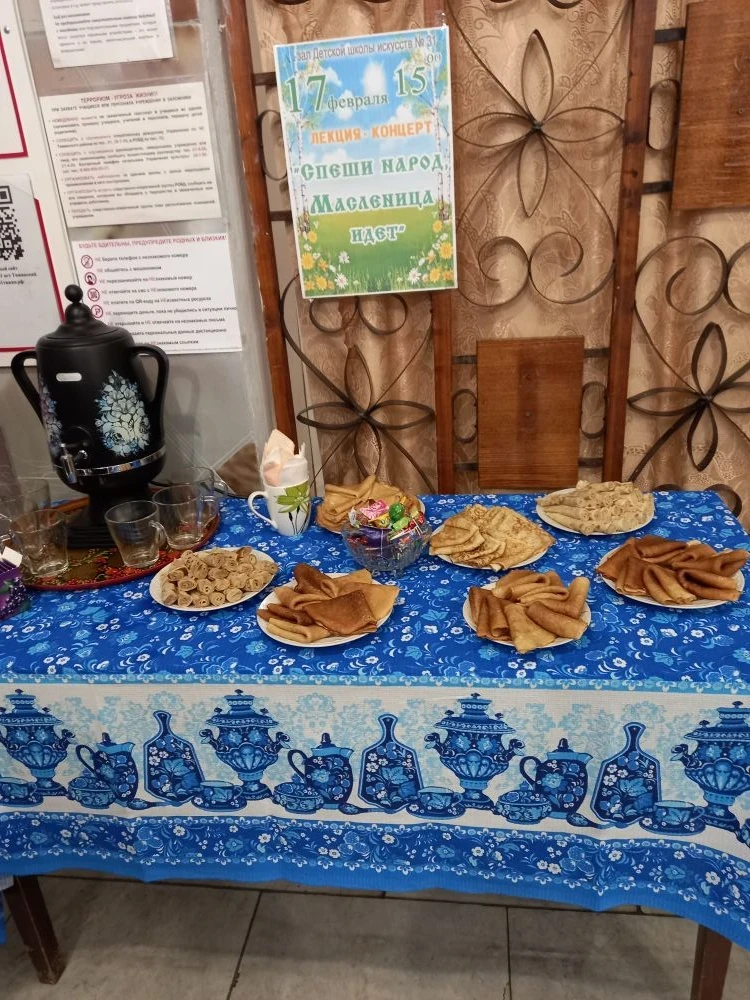 Главная » 2026 Февраль 18 » Лекция-концерт «Спеши народ - Масленица идёт» Лекция-концерт «Спеши народ - Масленица идёт» Спеши народ, Масленица идёт17 февраля в Детской школе искусств № 31 прошла лекция-концерт «Спеши народ - Масленица идёт». Ведущая Наталья Анатольевна Чухрова, заместитель директора по учебной работе, рассказала об истории, традициях и обычаях русского праздника «Масленица». Учащиеся отделения народного пения исполнили масленичные заклички и русские народные песни. В рамках мероприятия прошла выставка преподавателя Агропромышленного техникума Жогиной Галины Алексеевны «Тёщины вечёрки». По традиции масленичной недели преподаватели школы напекли блинов и угощали всех участников мероприятия. Учащимся очень понравилось мероприятие и они поблагодарили преподавателей за организацию праздника. #добромасленица #соседивместе #добрыесоседи #блин #праздник