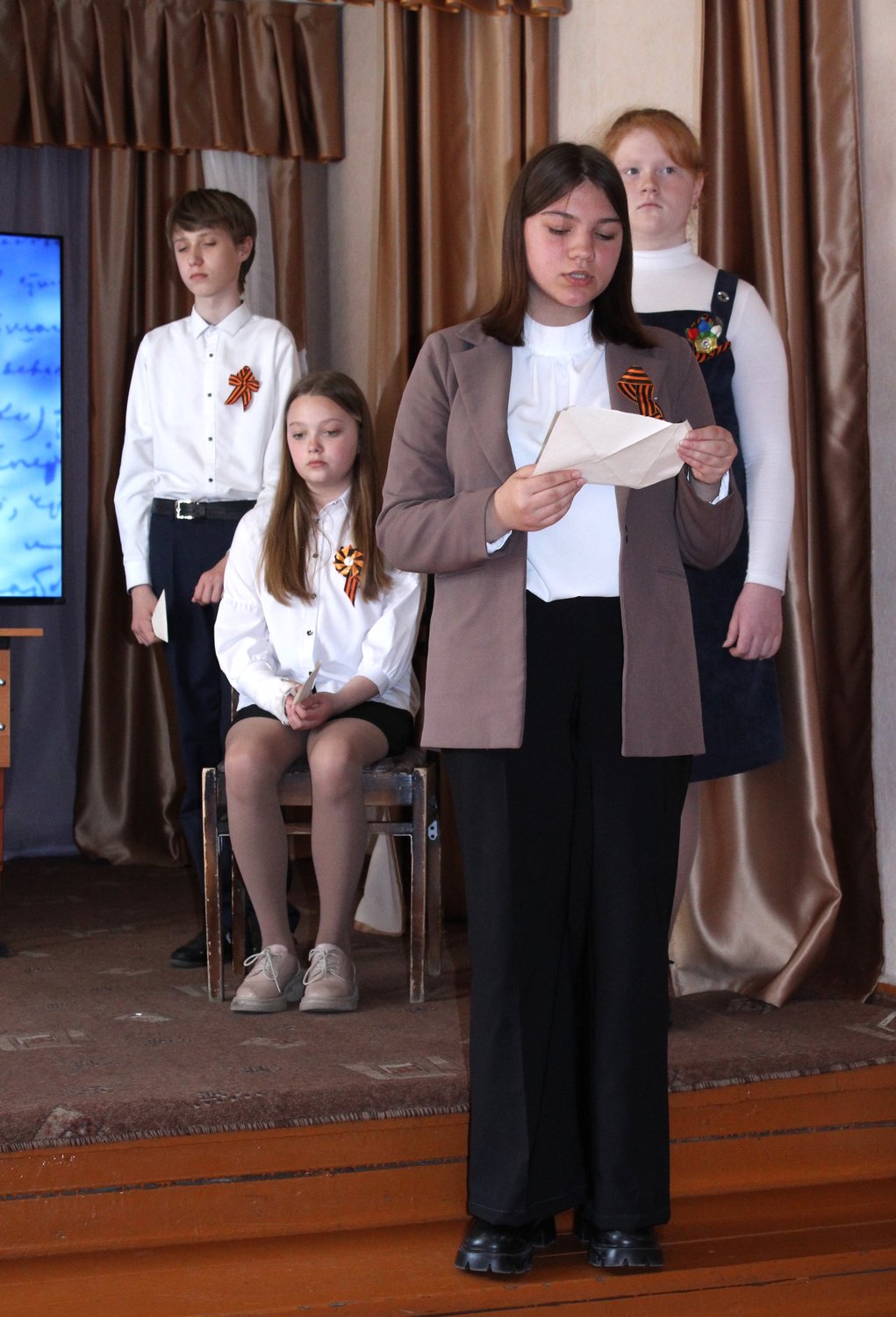 Главная » 2024 Май 8 » Литературно-историческая композиция «Жди меня» Литературно-историческая композиция «Жди меня» 07 мая в преддверии празднования 79 годовщины со дня Победы в Великой Отечественной войне, в детской школе искусств № 31 учащимися отделения театрального искусства была показана литературно-историческая композиция «Жди меня».Основу композиции составили письма фронтовиков, написанные своим родным и близким в годы Великой Отечественной войны. Со сцены также звучали стихотворения: К.Симонова, Ю.Друниной, М.Скуратовой, А.Басацкого, М.Джалиля и других поэтов. Музыкальным сопровождением композиции послужили песни военных лет «Огонёк», «Синий платочек» и другие, которые подготовил М.В.Безручко. Видео-презентацию из фотографий военных лет подготовил к показу К.Н.Петров, режиссёром-постановщиком композиции был А.В.Суханов, преподаватель отделения театрального искусства. ![]()
