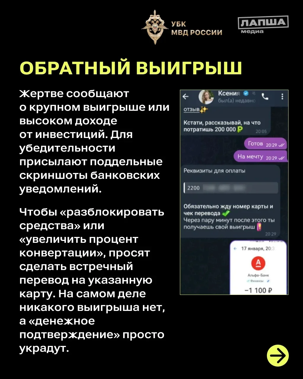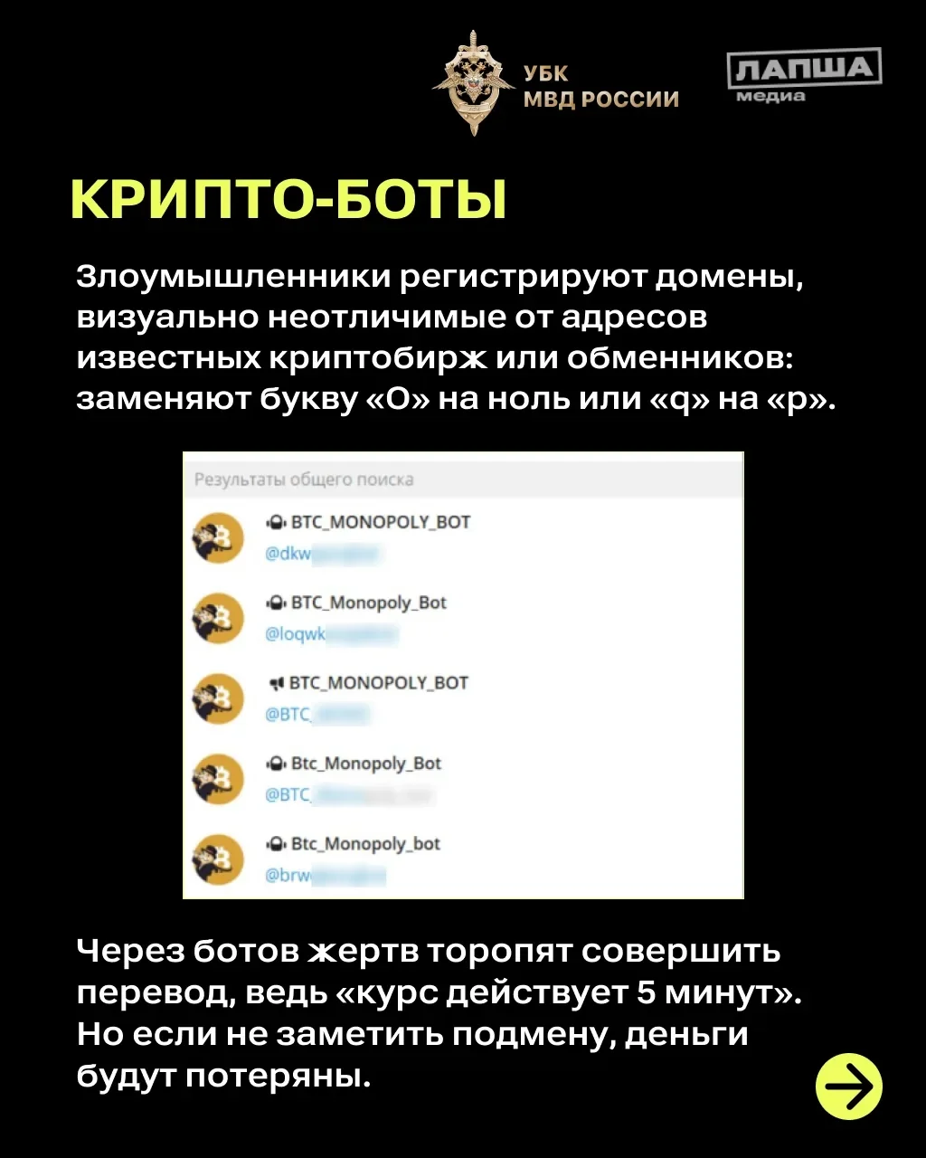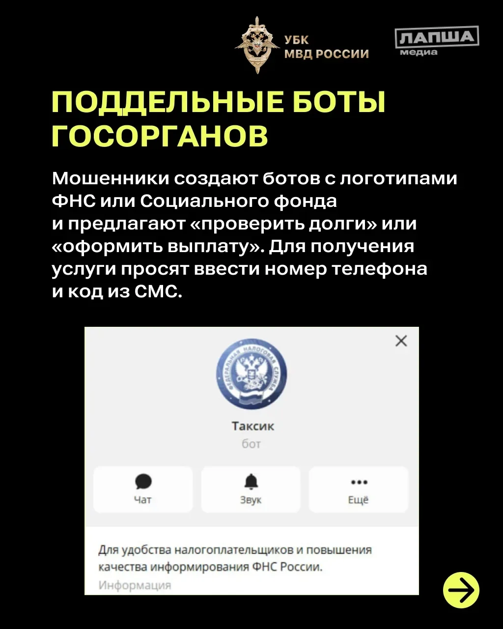 Главная » 2026 Апрель 6 » Мошеннические схемы в мессенджерах Мошеннические схемы в мессенджерах Фейковые боты госорганов, поддельные «Госуслуги», крипто-двойники и липовые рабочие чаты — мошенники в мессенджерах атакуют аккаунты десятками способов.Подробнее о том, какие угрозы могут поджидать пользователей и как от них защититься, читайте в карточках, подготовленных МВД России совместно с каналом «Лапша Медиа». ![]() ![]() ![]() ![]() ![]() ![]() ![]() ![]()