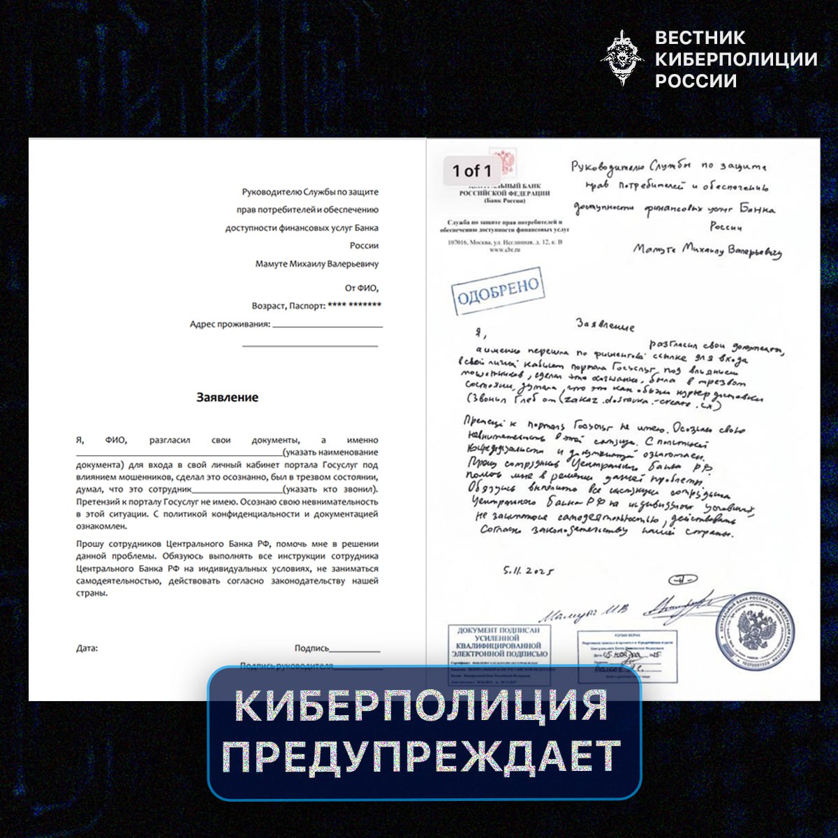 Главная » 2025 Ноябрь 14 » Мошенники предлагают подключиться к «секретной программе ИПБС»! Такой программы не существует! Мошенники предлагают подключиться к «секретной программе ИПБС»! Такой программы не существует! Вам звонят, представляясь «сотрудником Банка России», «специалистом по защите прав потребителей» или «уполномоченным представителем ЦБ», звонящий сообщает о «подозрительной активности»: якобы кто-то пытался получить доступ к вашему аккаунту на Госуслугах, банковскому счёту или персональным данным.Внушают, что ваши счета вот-вот заблокируют, деньги пропадут, а вы сами можете быть включены в список «риска» Росфинмониторинга. Чтобы «спасти ситуацию», предлагают подключиться к секретной программе ИПБС — якобы «единственному способу» защитить свои активы. Далее вас просят подписать заявление, в котором вы: Признаёте свою «вину»; Просите «помощи от ЦБ»; Обещаете «выполнять все инструкции» и «не заниматься самодеятельностью». Это может создать у вас иллюзию юридической ответственности за свои действия и легитимности процесса. После «оформления участия в программе» мошенники требуют указать все установленные банковские приложения и перевести деньги на безопасный счет. Банк России не работает напрямую с физическими лицами как банк. ЦБ РФ — это государственный регулятор. Он контролирует деятельность банков, страховых компаний, МФО и других финансовых организаций, но не оказывает гражданам персональные банковские или юридические услуги. У него нет «программ сопровождения» для частных лиц, он не назначает «уполномоченных представителей» для работы с вами лично и не заключает с вами индивидуальных договоров. Такой «ИПБС» не существует в правовом поле РФ Ни в законодательстве, ни на официальном сайте Банка России (cbr.ru ) вы не найдёте упоминаний об «Индивидуальной программе банковской сопровождаемости». Это название — вымышленное. ЦБ не налагает штрафы на граждан и не блокирует счета напрямую В документе говорится о штрафе в 250 000 рублей «в бесспорном порядке» и о блокировке счетов «по ФЗ-161». На самом деле ФЗ-161 регулирует национальную платёжную систему, а решения о блокировке счетов принимают банки или суды, не ЦБ. Штрафы же взыскиваются только по решению суда или налоговыми органами — и никогда «за разглашение участия в программе». Заявление о «разглашении данных Госуслуг» — манипулятивный приём Формулировка «я разгласил документы под влиянием мошенников» может выглядеть как признание вины, но на деле оно не имеет юридической силы и не требуется ни Банку России, ни порталу Госуслуг. Такие заявления используются, чтобы вызвать у человека тревогу и подтолкнуть его к дальнейшим действиям по инструкции. Официальные документы ЦБ не выглядят так. Настоящие нормативные акты Банка России публикуются на его сайте с чёткой структурой, номерами, датами, подписями должностных лиц и ссылками на законодательство. В них никогда не будет требований «не заниматься самодеятельностью» или «действовать строго по инструкциям назначенного сотрудника». Если вам прислали подобные документы — не выполняйте указания из них. Лучшая защита — спокойствие, внимательность и обращение только по официальным каналам: Горячая линия Банка России — 8 800 300-30-00 Официальный сайт — cbr.ru ![]()