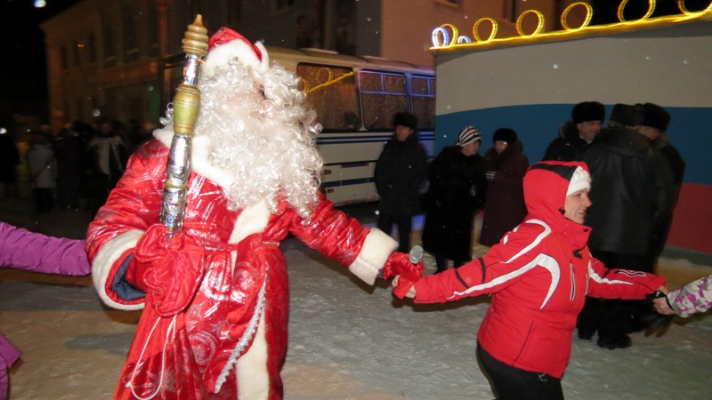 Главная » 2014 Январь 1 » Новогоднее поздравление Новогоднее поздравление На центральной площади посёлка Тяжинский местные жители принимали новогодние поздравления. По сложившейся традиции в два часа ночи тяжинцев приветствовали Дед Мороз и Снегурочка. Сказочные персонажи передали слово для поздравления главе Тяжинского городского поселения Александру Николаевичу Чайка: «Уважаемые земляки! Поздравляю вас с Новым 2014 годом! Новый год это большой семейный праздник и для взрослых и для детей. Этот год для нас с вами юбилейный. Нашему посёлку исполняется 120 лет, Тяжинскому району – 90. На Новый год каждый из нас загадывает пожелания. Так пусть они сбудутся. Здоровья вам, семейного тепла, достатка, любви и уважения. С Новым годом! Жители районного центра вместе с Дедом Морозом и Снегурочкой водили хороводы и исполняли задорные частушки.