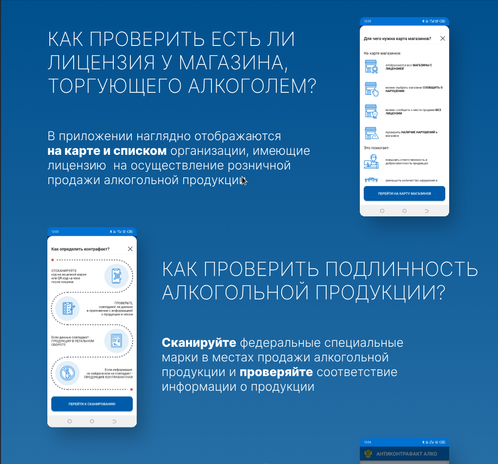 Главная » 2025 Ноябрь 7 » О работе мобильного приложения «АнтиконтрафактАлко» О работе мобильного приложения «АнтиконтрафактАлко» Наглядная информация о работе мобильного приложения «АнтиконтрафактАлко» размещена на официальном интернет - сайте Федеральной службы по контролю за алкогольным и табачным рынками: https://fsrar.gov.ru/antikontrafakt_alko. Мобильные приложения доступны для устройств на платформе Android и Apple. Для скачивания необходимо зайти в приложение App Store, Ru Store или Google Play и набрать в поиске наименование мобильного приложения «АнтиконтрафактАлко». Приложение Честный ЗНАК – это: - проверка товара по QR коду на этикетке - информация о производителе товара (дата, время и место производства, срок годности) - проверка подлинности штрихкода онлайн - определение подделки и контрафакта, защита потребителя от покупки фальсификата - регистрация жалобы на поддельные продукт- регулярные обновления базы товаров.