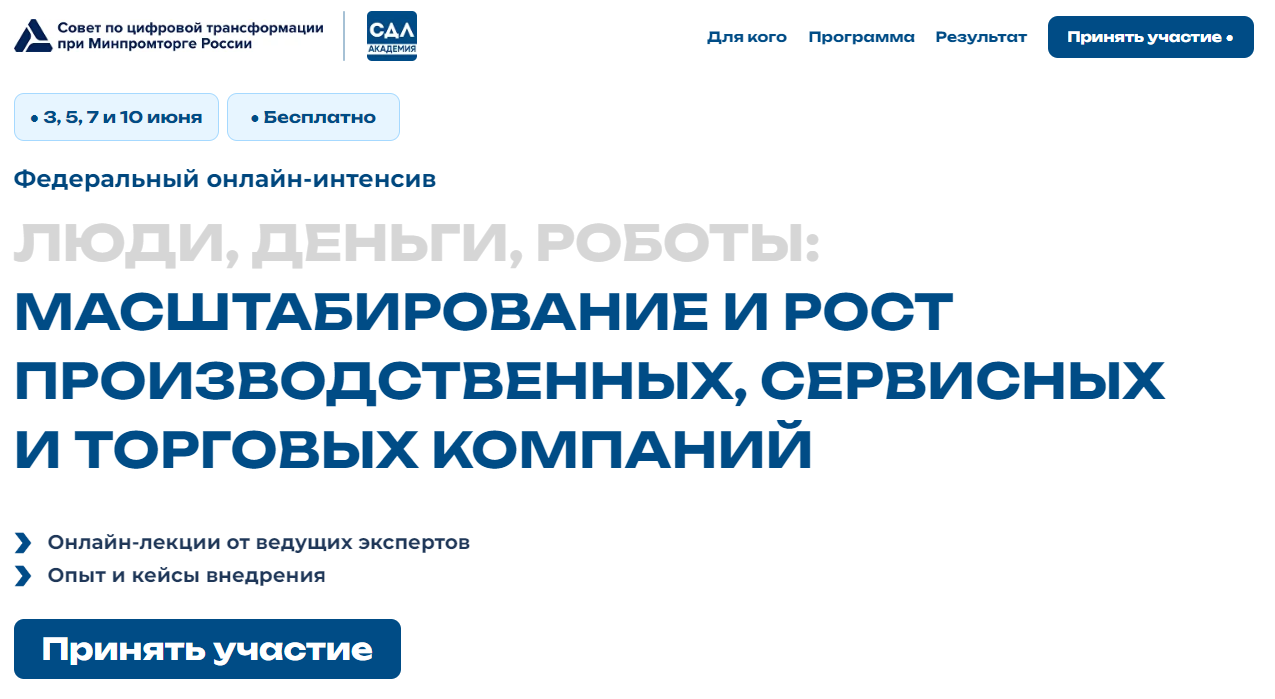 Главная » 2024 Май 27 » Онлайн-интенсив Онлайн-интенсив С 3 по 10 июня 2024 г. пройдет онлайн-интенсив «Люди, деньги, роботы: масштабирование и рост производственных, сервисных и торговых компаний» на базе консультационного совета по цифровой трансформации при Минпромторге России. Обучение будет полезно собственникам, директорам и руководителям подразделений, которые заинтересованы в новых знаниях и практиках, позволяющим совершенствовать операционную деятельность и внедрять проекты стратегического развития. Программа вебинаров (прилагается) включает актуальные вопросы: - управление персоналом; - управление финансовыми ресурсами и инвестициями; - возможности цифровой трансформации бизнеса; - развитие каналов продаж для масштабирования бизнеса. Мероприятие проводится на безвозмездной основе в онлайн формате. Пройти регистрацию возможно по ссылке: https://s-d-l.ru/intenciv-2024-06?utm_source=mpt По организационным вопросам обращаться к координатору: Тимошин Илья Сергеевич, тел.: +7(499)325-73-43, почта: sovet@s-d-l.ru