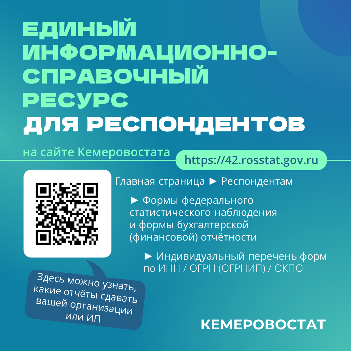 С порядком предоставления статистической отчётности в электронном виде можно ознакомиться на официальном сайте Кемеровостата в разделе «Респондентам» (Электронная отчетность).