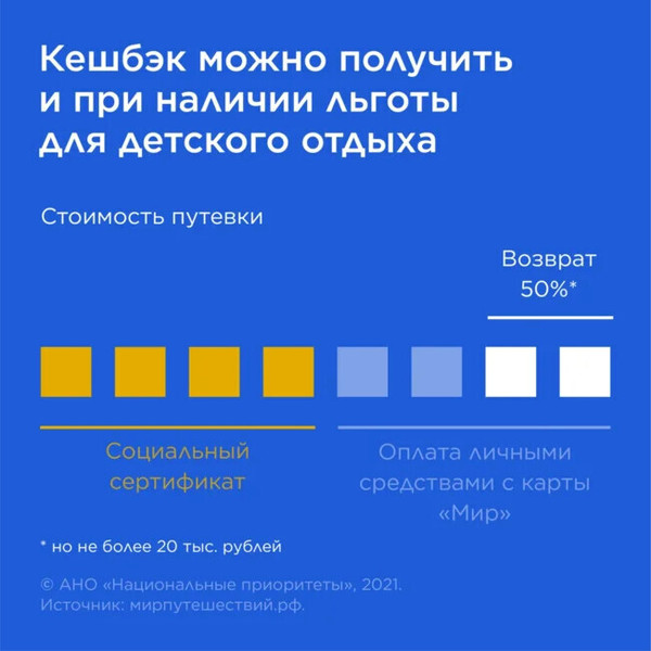 Главная » 2021 Май 31 » Госпрограмма возврата части средств за путёвки в детские лагеря Госпрограмма возврата части средств за путёвки в детские лагеря Детский отдых вдвое дешевле! Стартовала госпрограмма возврата части средств за путёвки в детские лагеря. Родители смогут получить до 50% стоимости путёвки, но не более 20 тысяч рублей. При этом ваш ребёнок может поехать отдыхать на любое число смен. А семьи с несколькими детьми смогут вернуть до 50% стоимости с каждой путёвки. Программа возврата средств распространяется и на тех, кто приобрёл путёвки до 25 мая 2021 года. Соответствующий механизм возврата запустят на портале госуслуг 15 июня 2021 года. Список лагерей, которые участвуют в программе, вы найдёте на мирпутешествий.рф Ну а самые интересные подробности — в наших карточках! Федеральное агентство по туризму (Ростуризм) #нацпроекты #нацпроекттуризм #туризмвприоритете