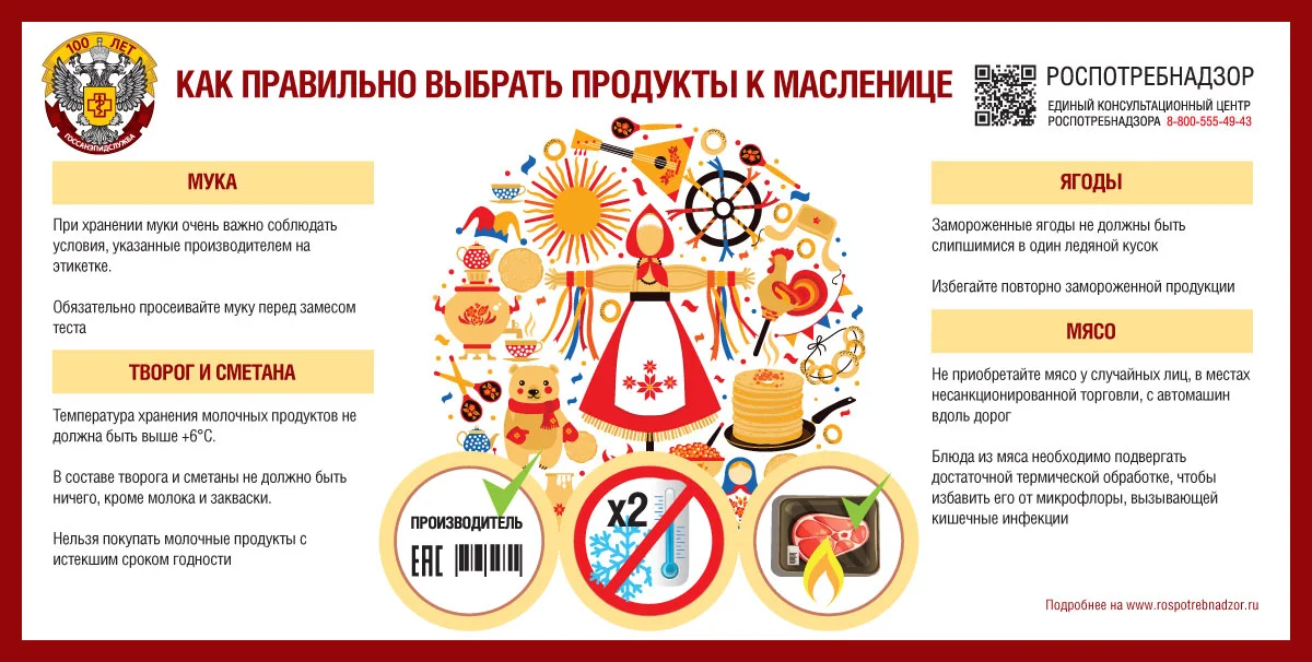 Главная » 2026 Февраль 16 » Управление Роспотребнадзора напоминает о необходимости соблюдения мер предосторожности Управление Роспотребнадзора напоминает о необходимости соблюдения мер предосторожности Наступила долгожданная весна - пора пробуждения природы и прихода тепла. Впереди нас ожидает масленичная неделя: скоро отовсюду будут слышны звуки хороводов и ароматы свежеиспеченных блинов с самыми разнообразными, на любой вкус начинками.Управление Роспотребнадзора напоминает о необходимости соблюдения мер предосторожности с целью профилактики кишечных инфекций и пищевых отравлений. Рациональный и внимательный подход к выбору всех необходимых пищевых продуктов для праздничного стола, а также соблюдение правил гигиены во время приготовления – гарантия успешно проведенных празднований, без последствий для Вашего здоровья и здоровья Ваших близких. Главным ингредиентом в составе блинов является мука. Наиболее распространенный сорт для приготовления блинов и хлебобулочных изделий это – высший. Действительно, именно высший сорт обладает максимальной степенью очистки от оболочек пшеничного зерна, что придает муке нежный белый цвет и максимально мелкий помол. Однако нужно понимать, что именно оболочки зерен пшеницы содержат в своем составе множество полезных для Вашего организма макро- и микронутриентов: белки, пищевые волокна (клетчатку), витамины, минеральные вещества, антиоксиданты. Поэтому рекомендуем Вам отдавать свое предпочтение муке других сортов, в частности цельно зерновой обойной. Такая мука менее клейкая и немного менее «податливая», учитывая это, при замешивании теста для блинов можно добавлять смесь из муки высшего сорта и цельно зерновой. Помните также о сроках годности и условиях хранения, муку следует хранить в бумажных пакетах или мешках при отсутствии повышенной влажности, пакеты с мукой необходимо закрывать с целью предупреждения проникновения насекомых или попадания загрязнителей. Также мука является легко воспламеняемым продуктом, поэтому не храните муку вблизи огня и нагревательных приборов, в том числе в процессе приготовления. Молоко. При выборе молока в первую очередь обращайте внимание на сроки годности продукта и целостность упаковки. Если Вы приобретаете сырое молоко, удостовериться в его качестве и безопасности можно потребовав ветеринарное свидетельство на продукцию у продавца. Также не забывайте о необходимости кипячения сырого молока перед его употреблением. Сливочное масло. В настоящем сливочном масле не должно быть растительных жиров. В составе должны фигурировать только сливки и цельное молоко, иногда соль. Если в составе присутствует пальмовое, арахисовое, кокосовое масло или ингредиент под названием «заменитель молочных жиров», вы держите в руках маргарин или спред, что бы там не обещала упаковка. Это уже не настоящее масло, а смесь из растительных и животных жиров. На потребительской упаковке должно быть написано не просто «масло», а «масло сливочное», «масло любительское», «масло крестьянское», «масло бутербродное» или «масло чайное». Яйцо куриное. Помните о том, что не допускается продажа яиц в отделах (секциях) организаций торговли, реализующих нефасованные продукты, готовые к употреблению. Запрещена реализация яиц с истекшим сроком годности, а также с заг