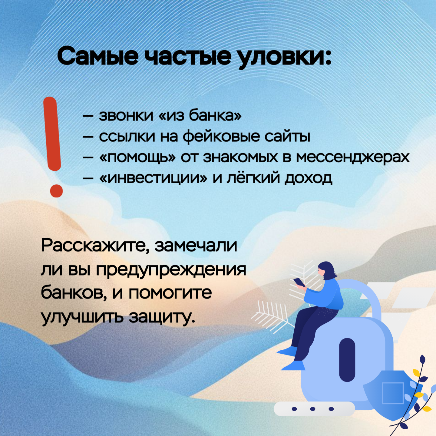 Главная » 2025 Ноябрь 11 » Вы уверены, что не попадётесь на уловку мошенников? Вы уверены, что не попадётесь на уловку мошенников? Банк России проводит опрос, насколько кузбассовцы чувствуют себя защищёнными при использовании онлайн-услуг и банковских сервисов. Это займёт всего 3 минуты, а ваши ответы помогут сделать финансовую сферу безопаснее для всех.В Кузбассе каждую неделю десятки людей теряют деньги из-за кибермошенников — звонков «из банка», фейковых сайтов и «помощи» от знакомых в мессенджерах. Расскажите, с чем сталкивались вы. Участвовать могут все — учителя, врачи, госслужащие, студенты, пенсионеры. Опрос анонимный и доступен до 28 ноября. Пройдите его прямо сейчас https://www.cbr.ru/information_security/anketa/ Ваше мнение — вклад в кибербезопасность региона! #финсибирь